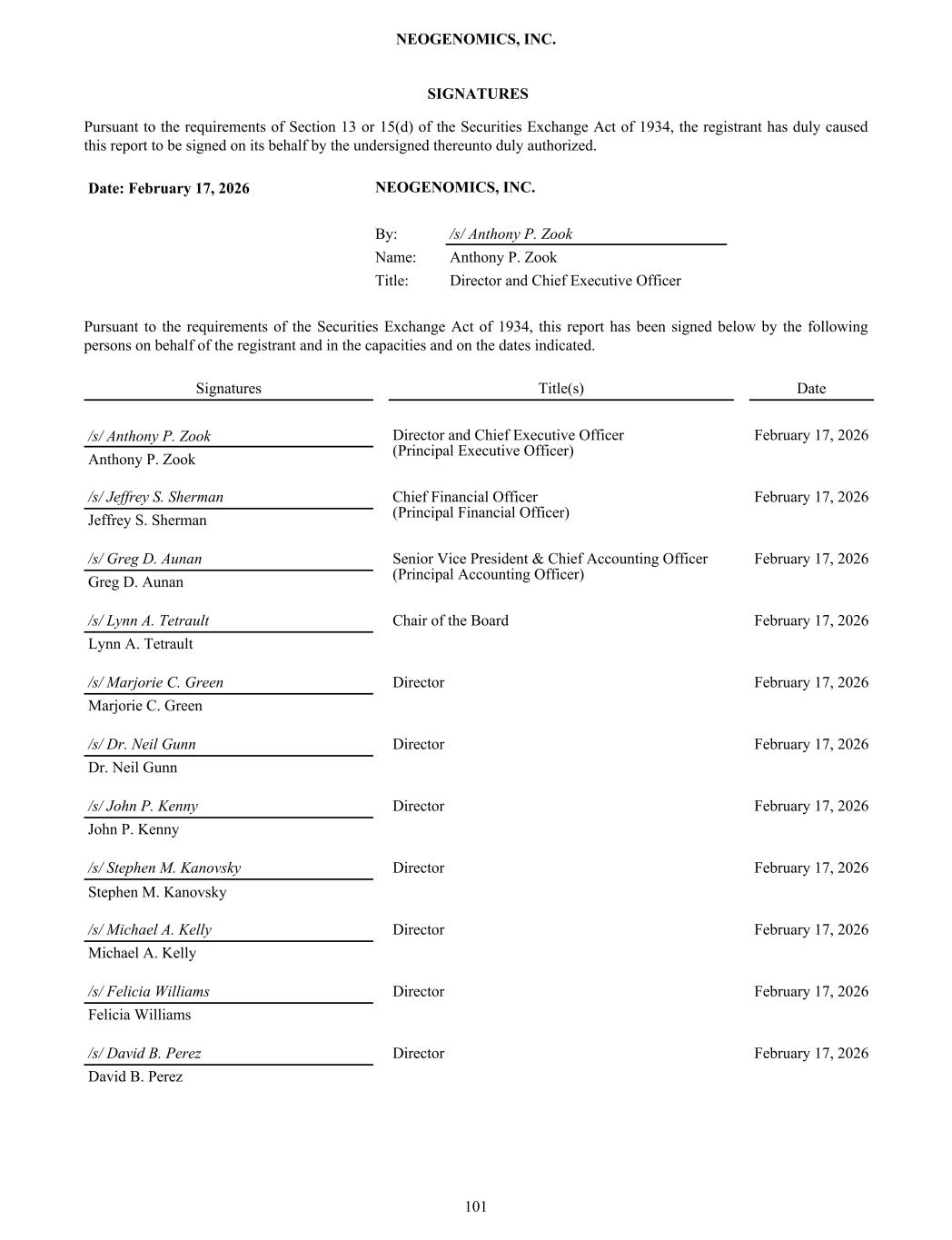 SIGNATURES Pursuant to the requirements of Section 13 or 15(d) of the Securities Exchange Act of 1934, the registrant has duly caused this report to be signed on its behalf by the undersigned thereunto duly authorized. Date: February 17, 2026 NEOGENOMICS, INC. By: /s/ Anthony P. Zook Name: Anthony P. Zook Title: Director and Chief Executive Officer Pursuant to the requirements of the Securities Exchange Act of 1934, this report has been signed below by the following persons on behalf of the registrant and in the capacities and on the dates indicated. Signatures Title(s) Date /s/ Anthony P. Zook Director and Chief Executive Officer (Principal Executive Officer) February 17, 2026 Anthony P. Zook /s/ Jeffrey S. Sherman Chief Financial Officer (Principal Financial Officer) February 17, 2026 Jeffrey S. Sherman /s/ Greg D. Aunan Senior Vice President & Chief Accounting Officer (Principal Accounting Officer) February 17, 2026 Greg D. Aunan /s/ Lynn A. Tetrault Chair of the Board February 17, 2026 Lynn A. Tetrault /s/ Marjorie C. Green Director February 17, 2026 Marjorie C. Green /s/ Dr. Neil Gunn Director February 17, 2026 Dr. Neil Gunn /s/ John P. Kenny Director February 17, 2026 John P. Kenny /s/ Stephen M. Kanovsky Director February 17, 2026 Stephen M. Kanovsky /s/ Michael A. Kelly Director February 17, 2026 Michael A. Kelly /s/ Felicia Williams Director February 17, 2026 Felicia Williams /s/ David B. Perez Director February 17, 2026 David B. Perez NEOGENOMICS, INC. 101