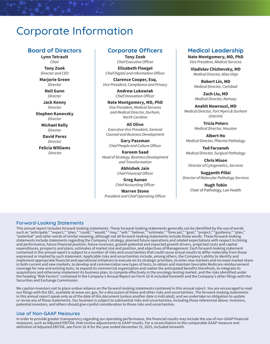 Corporate Officers Tony Zook Chief Executive Officer Elizabeth Floegel Chief Digital and Information Officer Clarence Cooper, Esq. Vice President, Compliance and Privacy Andrew Lukowiak Chief Innovation Officer Nate Montgomery, MD, PhD Vice President, Medical Services and Medical Director, Durham, North Carolina Ali Olivo Executive Vice President, General Counsel and Business Development Gary Passman Chief People and Culture Officer Kareem Saad Head of Strategy, Business Development and Transformation Abhishek Jain Chief Financial Officer Greg Aunan Chief Accounting Officer Warren Stone President and Chief Operating Officer Board of Directors Lynn Tetrault Chair Tony Zook Director and CEO Marjorie Green Director Neil Gunn Director Jack Kenny Director Stephen Kanovsky Director Michael Kelly Director David Perez Director Felicia Williams Director Medical Leadership Nate Montgomery, MD, PhD Vice President, Medical Services Vladislav Chizhevsky, MD Medical Director, Aliso Viejo Robert Lin, MD Medical Director, Carlsbad Zach Liu, MD Medical Director, Ramsey Anahit Nowrouzi, MD Medical Director, Fort Myers & Durham (Interim) Tricia Peters Medical Director, Houston Albert Ho Medical Director, Pharma Pathology Ted Farzaneh Medical Director, Surgical Pathology Chris Mixon Director of Cytogenetics, Services Sugganth Pillei Director of Molecular Pathology Services Hugh Tobin Chair of Pathology, Lee Health Forward-Looking Statements This annual report includes forward-looking statements. These forward-looking statements generally can be identified by the use of words such as “anticipate,” “expect,” “plan,” “could,” “would,” “may,” “will,” “believe,” “estimate,” “forecast,” “goal,” “project,” “guidance,” “plan,” “potential” and other words of similar meaning, although not all forward-looking statements include these words. These forward-looking statements include statements regarding the Company’s strategy, planned future operations and related expectations with respect to timing and performance, future financial position, future revenues, growth potential and expected growth drivers, projected costs and capital expenditures, prospects and plans, estimates of market size and position, and objectives of Management. Each forward-looking statement contained in this annual report is subject to a number of risks and uncertainties that could cause actual results to differ materially from those expressed or implied by such statement. Applicable risks and uncertainties include, among others, the Company’s ability to identify and implement appropriate financial and operational initiatives to execute on its strategic priorities, to enter new markets and increase market share in both current and new markets, to develop and commercialize new types of tests, to obtain and maintain favorable Medicare reimbursement coverage for new and existing tests, to expand its commercial organization and realize the anticipated benefits therefrom, to integrate its acquisitions and otherwise implement its business plan, to compete effectively in the oncology testing market, and the risks identified under the heading “Risk Factors” contained in the Company’s Annual Report on Form 10-K included herewith and the Company’s other filings with the Securities and Exchange Commission. We caution investors not to place undue reliance on the forward-looking statements contained in this annual report. You are encouraged to read our filings with the SEC, available at www.sec.gov, for a discussion of these and other risks and uncertainties. The forward-looking statements in this annual report speak only as of the date of this document (unless another date is indicated), and we undertake no obligation to update or revise any of these statements. Our business is subject to substantial risks and uncertainties, including those referenced above. Investors, potential investors, and others should give careful consideration to these risks and uncertainties. Use of Non-GAAP Measures In order to provide greater transparency regarding our operating performance, the financial results may include the use of non-GAAP financial measures, such as Adjusted EBITDA, that involve adjustments to GAAP results. For a reconciliation to the comparable GAAP measure and definition of Adjusted EBITDA, see Form 10-K for the year ended December 31, 2025, included herewith. Corporate Information
