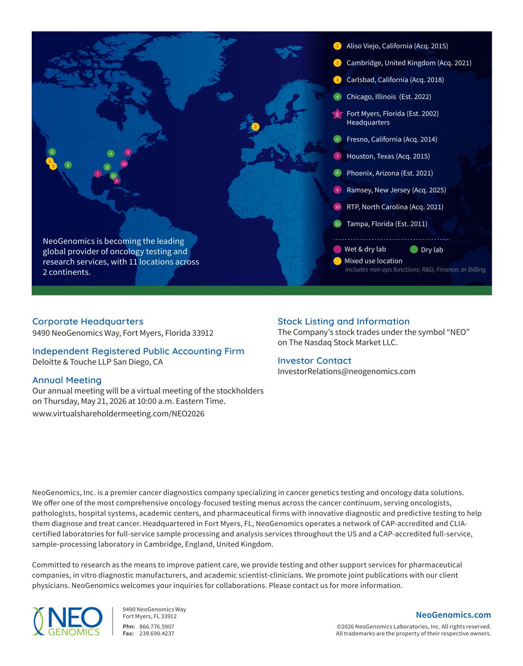 NeoGenomics, Inc. is a premier cancer diagnostics company specializing in cancer genetics testing and oncology data solutions. We offer one of the most comprehensive oncology-focused testing menus across the cancer continuum, serving oncologists, pathologists, hospital systems, academic centers, and pharmaceutical firms with innovative diagnostic and predictive testing to help them diagnose and treat cancer. Headquartered in Fort Myers, FL, NeoGenomics operates a network of CAP-accredited and CLIA- certified laboratories for full-service sample processing and analysis services throughout the US and a CAP-accredited full-service, sample-processing laboratory in Cambridge, England, United Kingdom. Committed to research as the means to improve patient care, we provide testing and other support services for pharmaceutical companies, in vitro diagnostic manufacturers, and academic scientist-clinicians. We promote joint publications with our client physicians. NeoGenomics welcomes your inquiries for collaborations. Please contact us for more information. 2 1 10 2 4 3 7 8 9 6 11 1 3 8 6 4 10 9 7 8 11 5 5 Aliso Viejo, California (Acq. 2015) Cambridge, United Kingdom (Acq. 2021) Carlsbad, California (Acq. 2018) Chicago, Illinois (Est. 2022) Fort Myers, Florida (Est. 2002) Headquarters Fresno, California (Acq. 2014) Houston, Texas (Acq. 2015) Phoenix, Arizona (Est. 2021) Ramsey, New Jersey (Acq. 2025) RTP, North Carolina (Acq. 2021) Tampa, Florida (Est. 2011) Wet & dry lab Mixed use location Dry lab Includes non-ops functions; R&D, Finance, or Billing NeoGenomics is becoming the leading global provider of oncology testing and research services, with 11 locations across 2 continents. 9490 NeoGenomics Way Fort Myers, FL 33912 Phn: 866.776.5907 Fax: 239.690.4237 NeoGenomics.com ©2026 NeoGenomics Laboratories, Inc. All rights reserved. All trademarks are the property of their respective owners. Corporate Headquarters 9490 NeoGenomics Way, Fort Myers, Florida 33912 Independent Registered Public Accounting Firm Deloitte & Touche LLP San Diego, CA Annual Meeting Our annual meeting will be a virtual meeting of the stockholders on Thursday, May 21, 2026 at 10:00 a.m. Eastern Time. www.virtualshareholdermeeting.com/NEO2026 Stock Listing and Information The Company’s stock trades under the symbol “NEO” on The Nasdaq Stock Market LLC. Investor Contact InvestorRelations@neogenomics.com